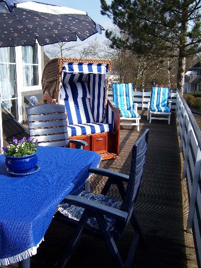 Ein Strandkorb gehört ebenfalls zur Ausstattung des großen Sonnenbalkons.